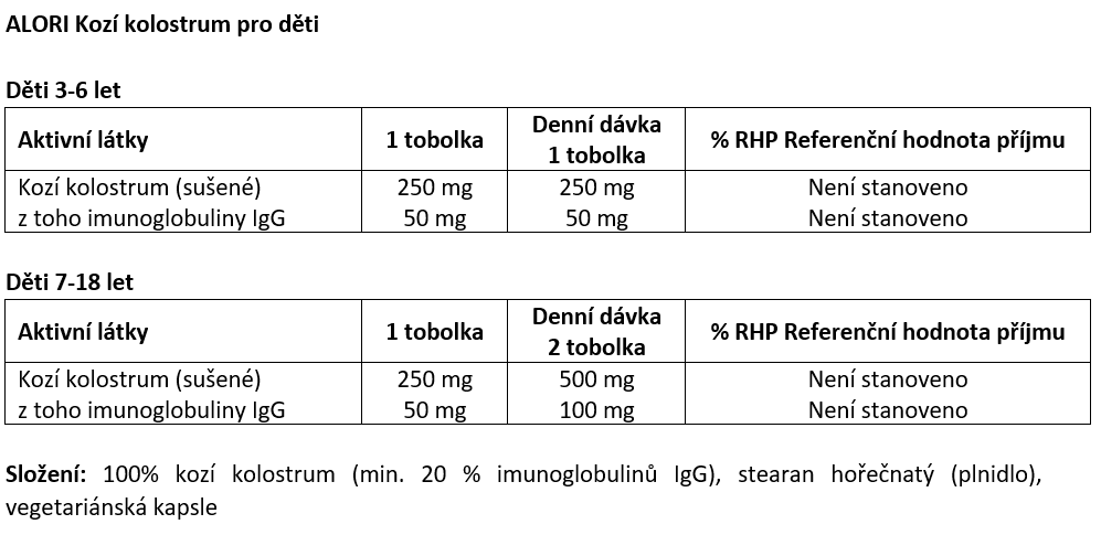 Složení: 100% kozí kolostrum (min. 20 % imunoglobulinů IgG), stearan hořečnatý (plnidlo), vegetariánská kapsle