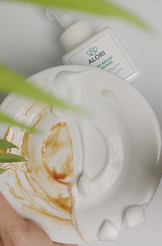 Pěna má unikátní recepturu a silné odmašťovací účinky pro rychlé a jednoduché mytí nádobí bez nutnosti namáčet houbičku.