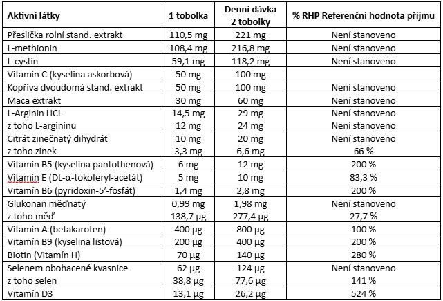 Složení: Přeslička rolní (Equisetum arvense) standardizovaný extrakt z celé rostliny (křemík 7 %), L-methionin, L-cystin, Vitamín C (kyselina askorbová), kopřiva dvoudomá (Urtica dioica) standardizovaný extrakt z kořene (kyselina křemičitá 1 %), maca peruánská (Lepidium Meyenii) extrakt z kořene (10:1), L-arginin hydrochlorid, citrát zinečnatý dihydrát, vitamín B5 (kyselina pantothenová), vitamín E, vitamín B6 (pyridoxin), glukonan měďnatý, vitamín A (betakaroten), vitamín B9 (kyselina listová), biotin (vitamín H), selenem obohacené kvasnice, vitamín D3, stearan hořečnatý (plnidlo), vegetariánská kapsle.